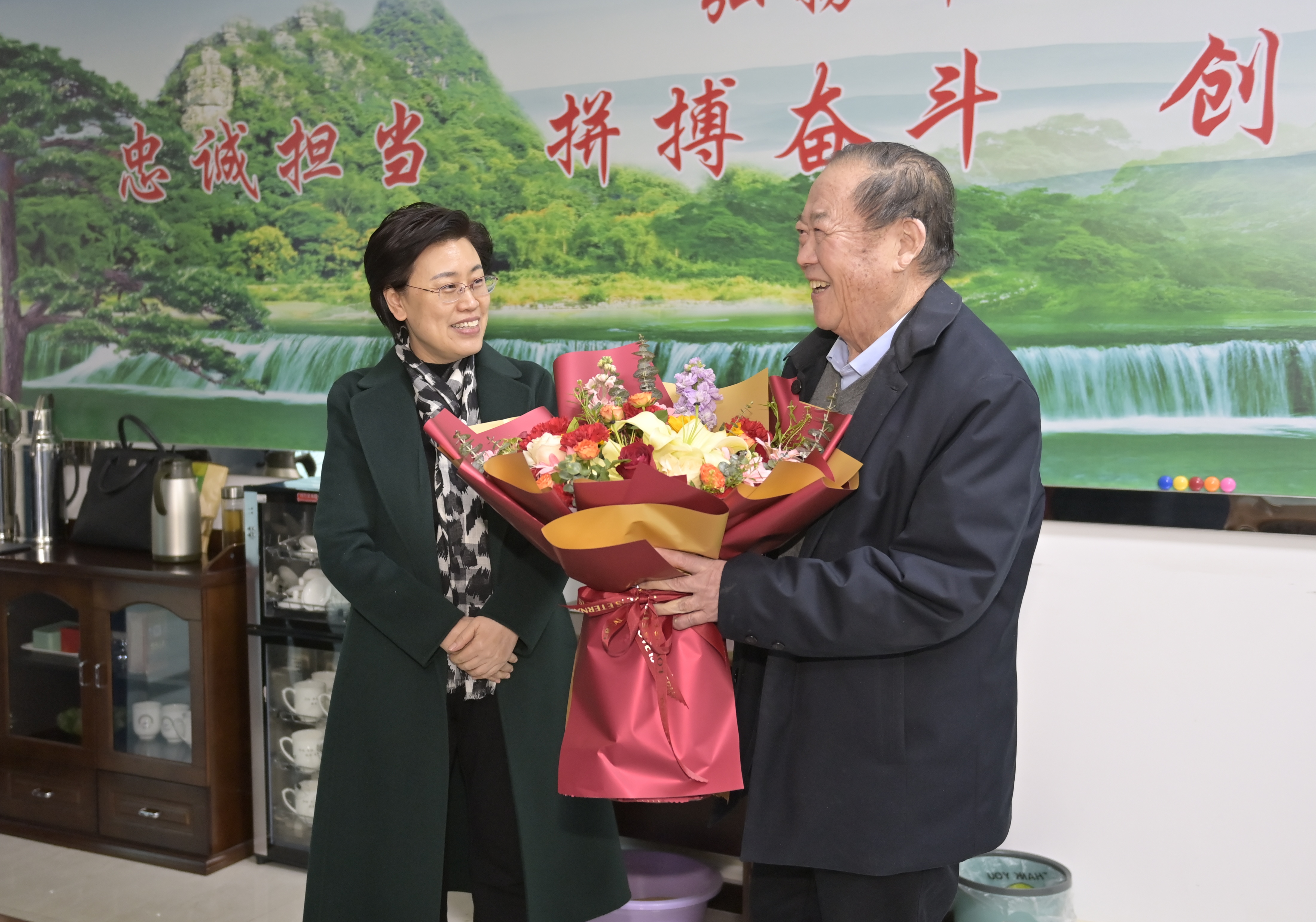 来到炼焦煤资源绿色开发全国重点实验室,陈向平为张铁岗送上鲜花和慰问金,详细了解张铁岗近期的工作和身体等情况,对张铁岗多年来为平顶山市和博奥体育·(中国)官方网站发展作出的重大贡献表示感谢,并向他致以新春美好祝福。陈向平说,您是从平顶山和博奥体育·(中国)官方网站走出来的院士,也是我们的骄傲。长期以来,您为地方经济发展和企业安全生产作出了突出贡献,新春佳节将至,我代表市四大班子提前向您拜年,祝您新春愉快、身体健康。